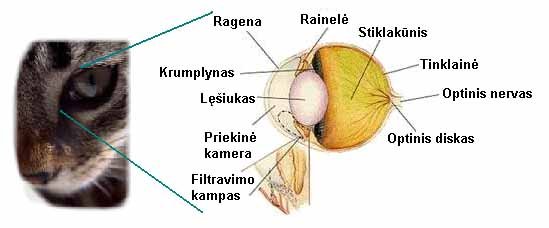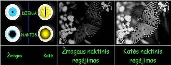 Tačiau katės yra šiek tiek trumparegės, tai rodo, kad jos labiau prisitaikę stebėti artimesnius objektus, tokius kaip grobis, kurį gali pasigauti kelių šuolių atstumu. Objektai, esantys toliau kaip keletą šimtų metrų, retai kada domina kates. Katės sugeba iš 5 metrų atstumo nušokti ant siauros palangės ir nepaliesti stiklo. Toks sugebėjimas reikalauja ne tik puikios pusiausvyros, bet ir tikslaus atstumo suvokimo. Kačių akių tinklainėje yra tiek kūgelių, tiek stiebelių. Stiebeliai yra receptoriai, kuriuos akis naudoja naktiniam regėjimui ir judesio užfiksavimui. Kūgeliai naudojami dieną ir priima spalvinę informaciją. Lyginant su žmonėmis, katės turi daugiau stiebelių nei kūgelių, todėl jos geriau mato naktį ir geriau pastebi judančius objektus. Silpnoje šviesoje, pavyzdžiui naktį, spalvų nesimato, tik juoda, balta ir pilki atspalviai. Kačių vyzdys yra elipsės formos ir tai padeda jam atsidarinėti ir užsidarinėti daug greičiau nei apskritos formos vyzdžiui, be to – jis yra didesnis. Tai leidžia didesniam šviesos kiekiui patekti į akį. Katės akies dugne yra veidrodinė membrana, vadinama Tapetum. Ji atspindi per stiebelius perėjusią šviesą atgal į tuos pačius stiebelius, tik iš kitos pusės. Dėl to padvigubėja šviesos ekspozicijos laikas ir katės gali matyti tamsoje. Nors katės ir negali matyti absoliučioje tamsoje, tačiau pro debesų plyšius prasišviečiančių žvaigždžių šviesos joms pakanka medžioklei. Naktį katės naudojasi savo ypatingai jautria klausa, kad nustatyti grobio buvimo vietą, o savo aštraus žvilgsnio pagalba nusitaiko ir pagriebia. Geltona šviesa, matoma kačių akyse pašvietus į jas žibintuvėliu yra ne kas kita kaip ta pati šviesa, atsispindėjusi nuo Tapetum membranos.