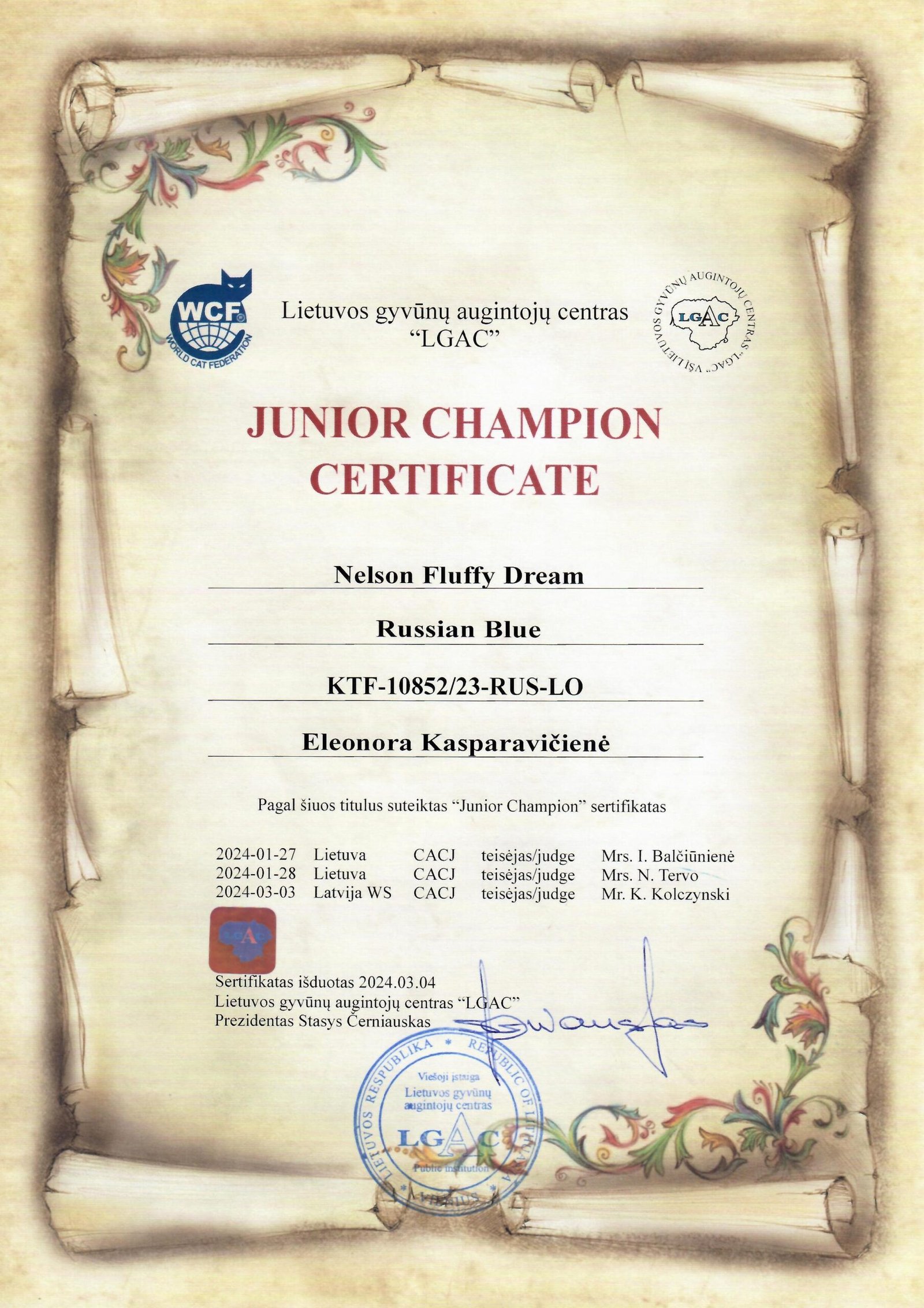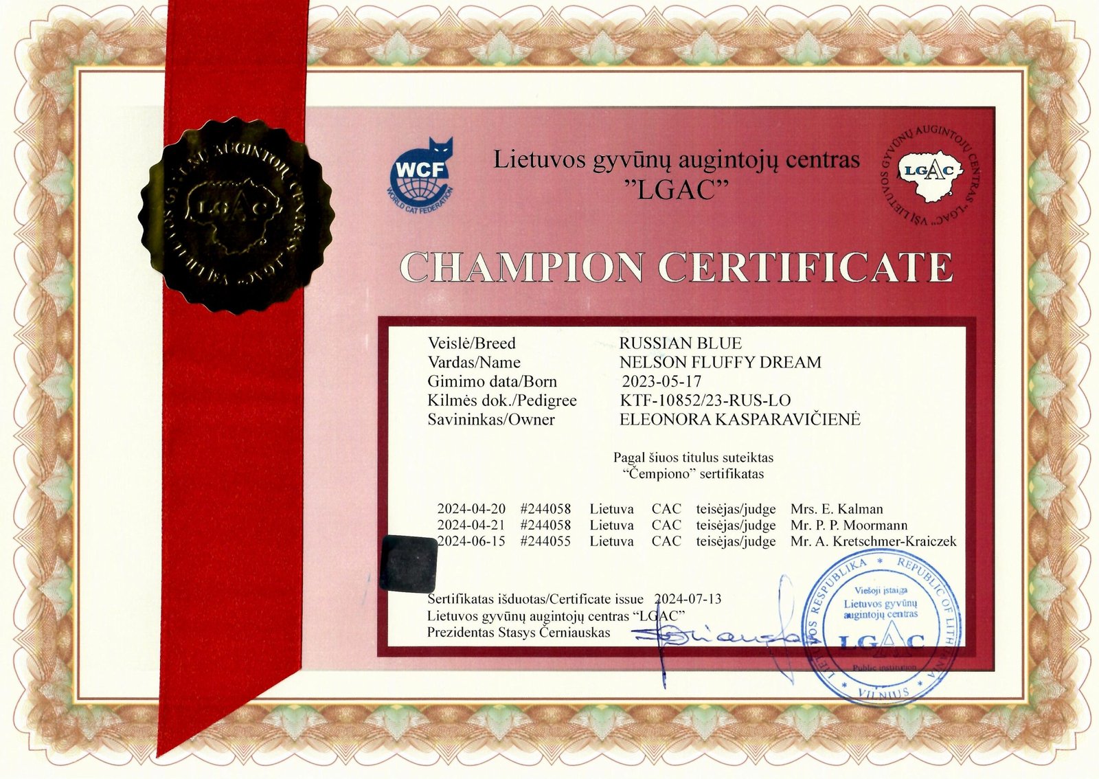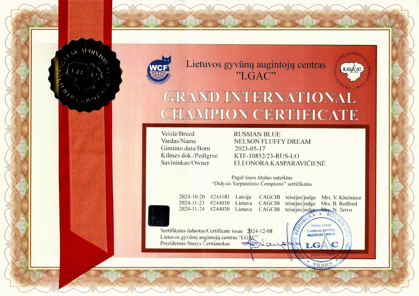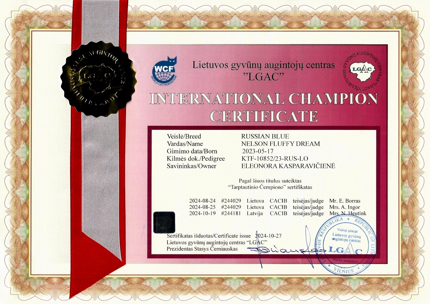 | Illiriya Fluffy Dream | GICH Caesar of Žydroji fėja*LT | WCH Silver of Žydroji fėja*LT | ECH Jeffry of Happy Song |